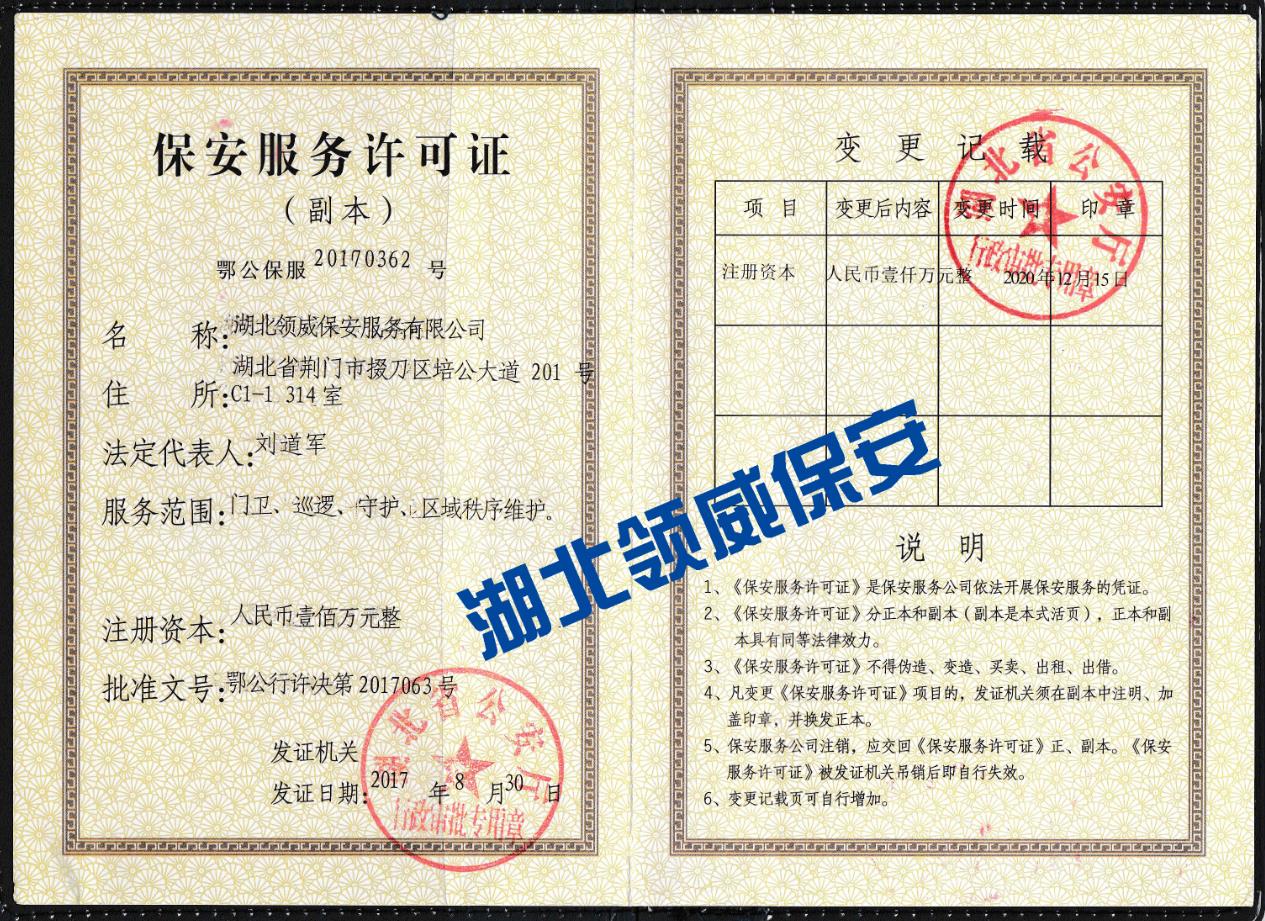 湖北領(lǐng)威保安服務(wù)有限公司專注荊門保安、荊門安保、荊門臨保、荊門秩序維護等服務(wù)